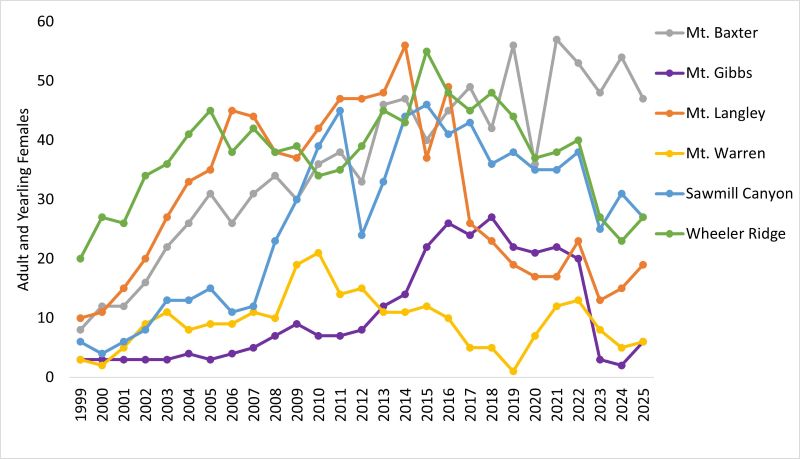 In bighorn sheep, the number of adult ewes determines how quickly a population can grow or recover from losses. Because of this, the health of a population is often gauged by the number of ewes present. This graph shows population trajectories for adult and yearling females from 1999-2025 based on a combination of population estimates (marked resight and minimum counts) for 6 herds in the Sierra with annual population data.