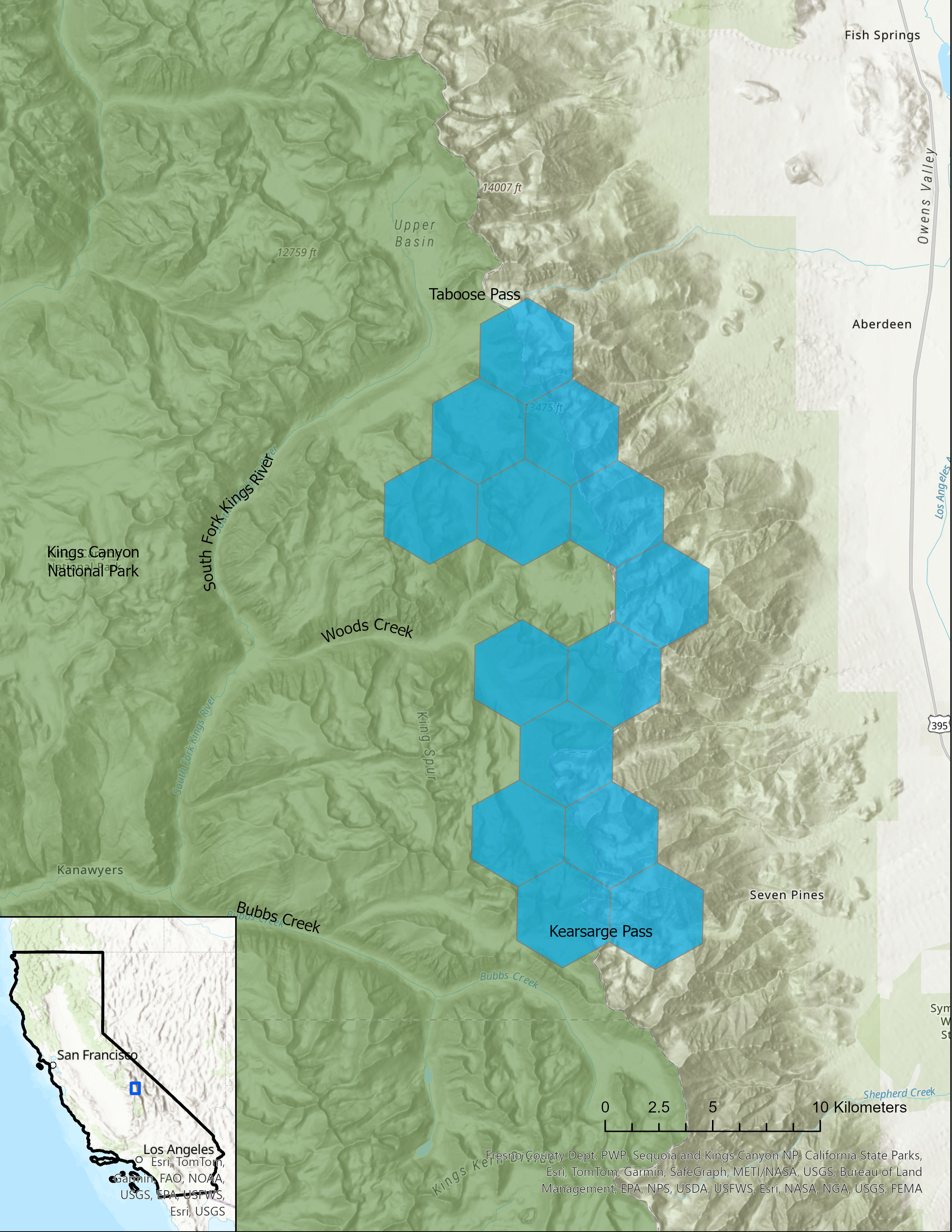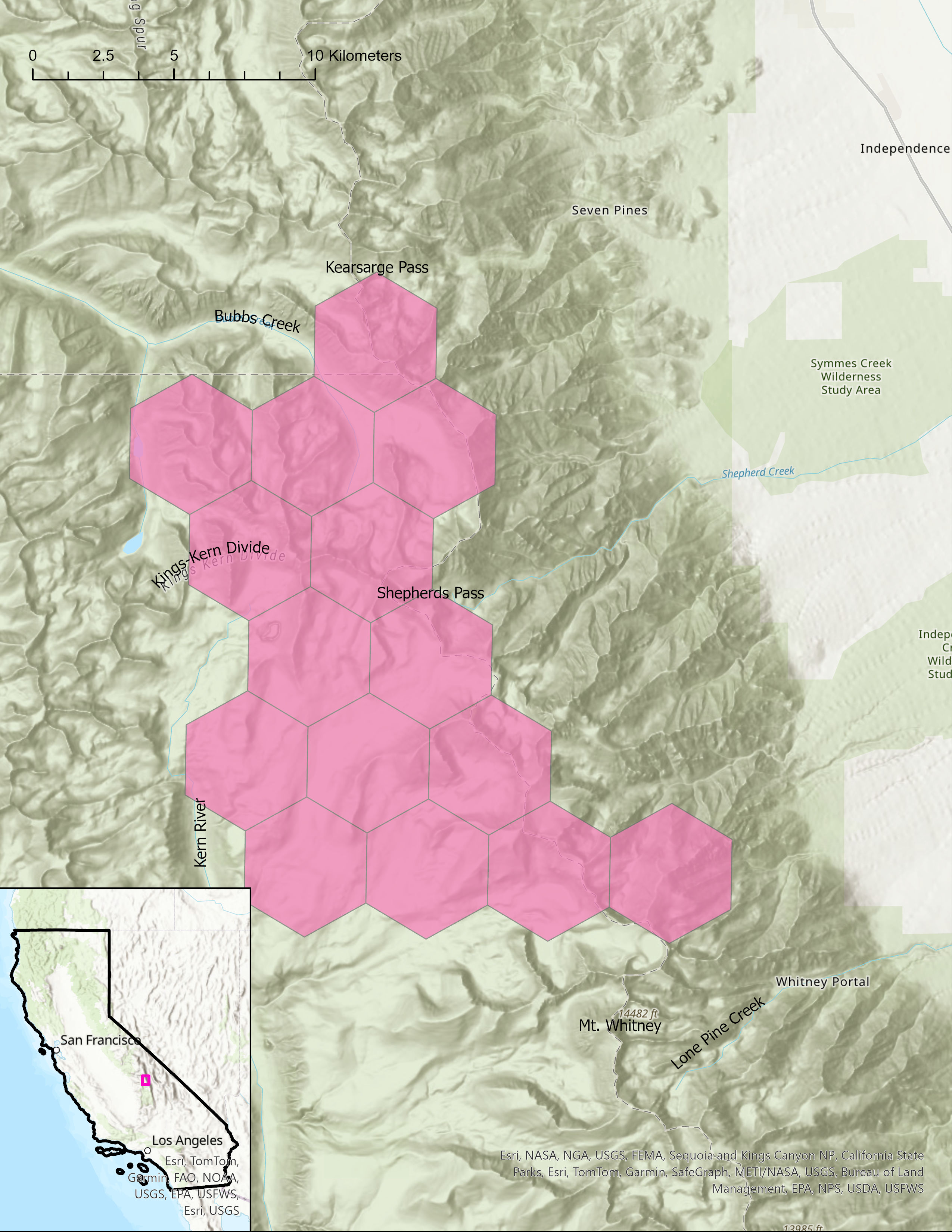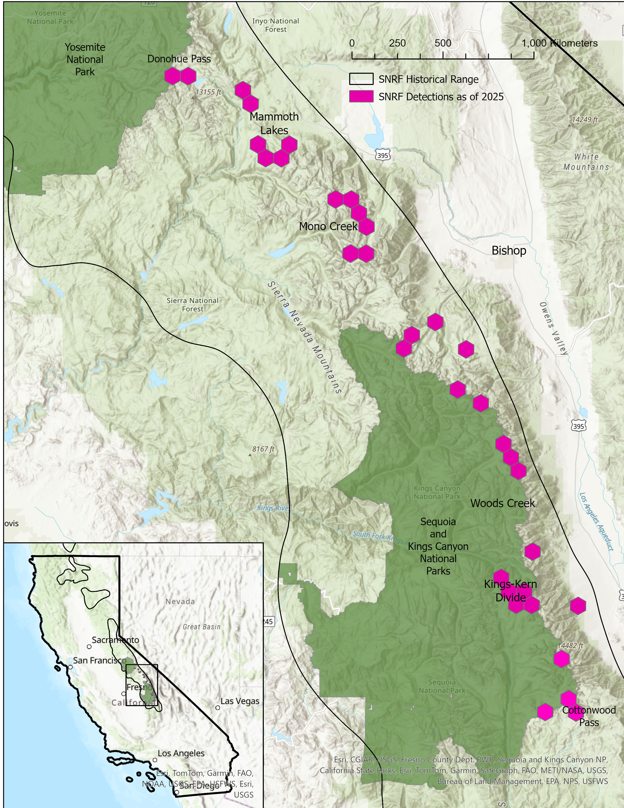 In winter, the Sierra Nevada may look like a barren, inhospitable moonscape. Yet a surprisingly diverse assemblage of carnivore species can be found in this alpine zone during the harshest months of the year. In 2015, we began an ongoing study to better understand the distribution of these species. Each winter we deploy 20-30 remote cameras at high elevations (> 10,000 ft) of the Sierra Nevada south of Yosemite National Park. We design our surveys to detect mesocarnivores (small- or medium-sized carnivores) such as coyotes (Canis latrans), martens (Martes caurina), long-tailed weasels (Mustela frenata), short-tailed weasels (Mustela erminea), bobcats (Lynx rufus), and badgers(opens in new tab) (Taxidea taxus). Of particular interest are detections of rare, threatened, or endangered species like Sierra Nevada red foxes (Vulpes vulpes necator) and wolverines (Gulo gulo luscus). When remote cameras photograph target species, we follow up with ground surveys to collect fecal material for genetic identification. We use these data to model the distribution and density of carnivores in high-elevation habitats. In many of our project locations, our study represents the first systematic effort to survey for wildlife in winter, and some of the species we have detected were not previously known to use alpine habitat at any time of year. The information we are gathering provides valuable insight to managers planning for the conservation of these species and their habitat.